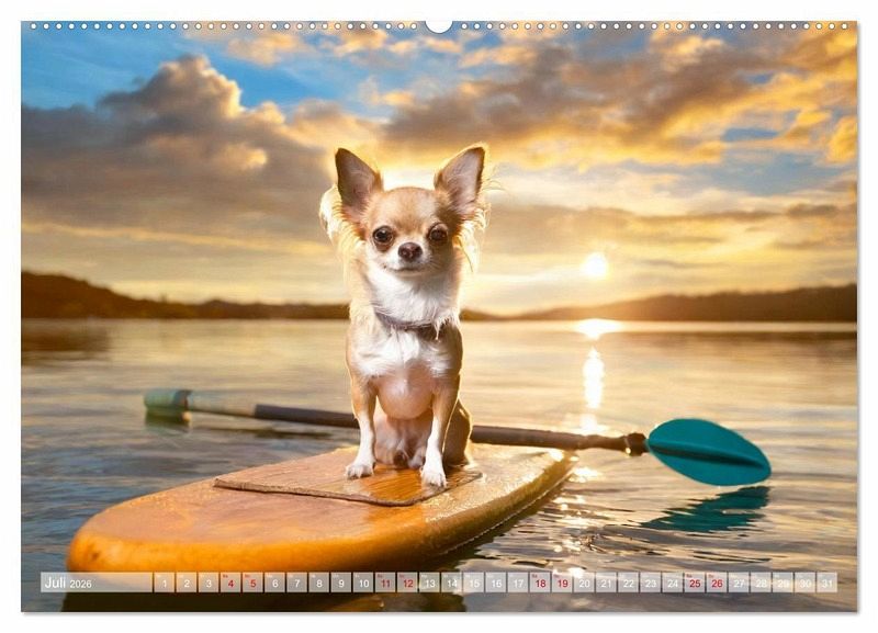 Juli: Chihuahua entspannt beim Stand Up Paddeling im Sonnenuntergang auf einem See