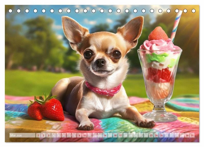Mai: Chihuahua liegt auf einer bunten Decke im Park, vor sich einen großen leckeren Eisbecher