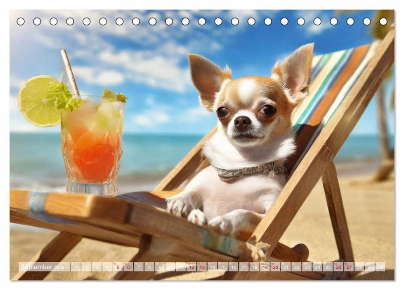 September: Kleiner Chihuahua chillt auf einem Liegestuhl am Strand, vor sich ein bunter Cocktail
