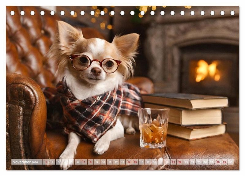 November: Chihuahua liegt vor einem Kamin auf einem Ledersessel, neben sich einige Bücher und ein Glas Whisky