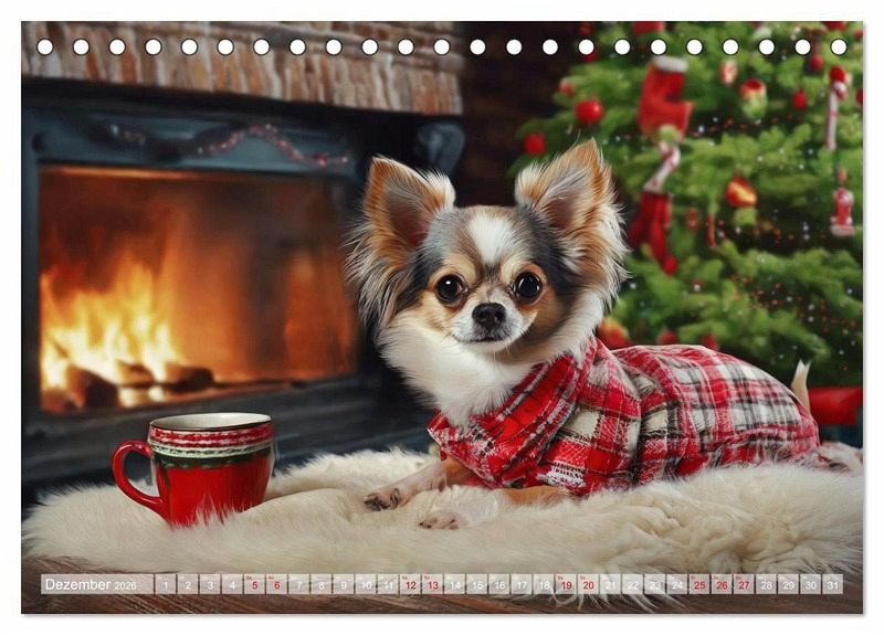 Dezember: Chihuahua liegt auf einem flauschigen Fell vor dem Kamin, neben sich eine Tasse Tee