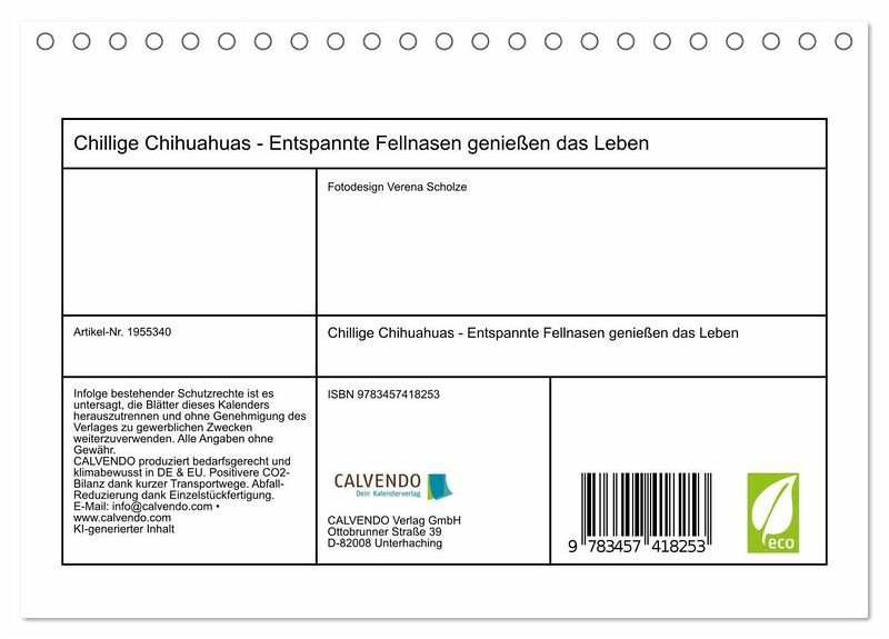 QUALITÄT - Hochwertiger Fotokalender mit 12 wunderschönen Motiven auf lichtbeständigem Bilderdruckpapier, robuste Spiralbindung.NACHHALTIG - deutliche Abfallreduzierung durch bedarfsgerechte Einzelstückfertigung, umweltfreundliches FSC-zertifiziertes Papier, Produktion in Deutschland, klimabewusste Logistik.PERFEKTES GESCHENK - Kalender für Freunde und Familie, für Kinder und Erwachsene, jung und alt, zu Weihnachten, Geburtstag oder zwischendurch.VIELFALT - Bildkalender in verschiedenen Formaten, z.B. DIN A5, DIN A4, DIN A3 sowie DIN A2. Ob Naturmotiv, Gemälde oder Fotos, ideal für ein persönliches Wohlfühlambiente.Entspannung und Balance mit Chihuahuas von Autor(in): Fotodesign Verena Scholze