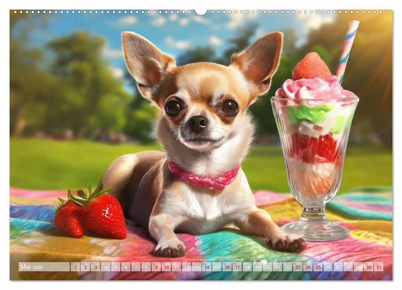 Mai: Chihuahua liegt auf einer bunten Decke im Park, vor sich einen großen leckeren Eisbecher