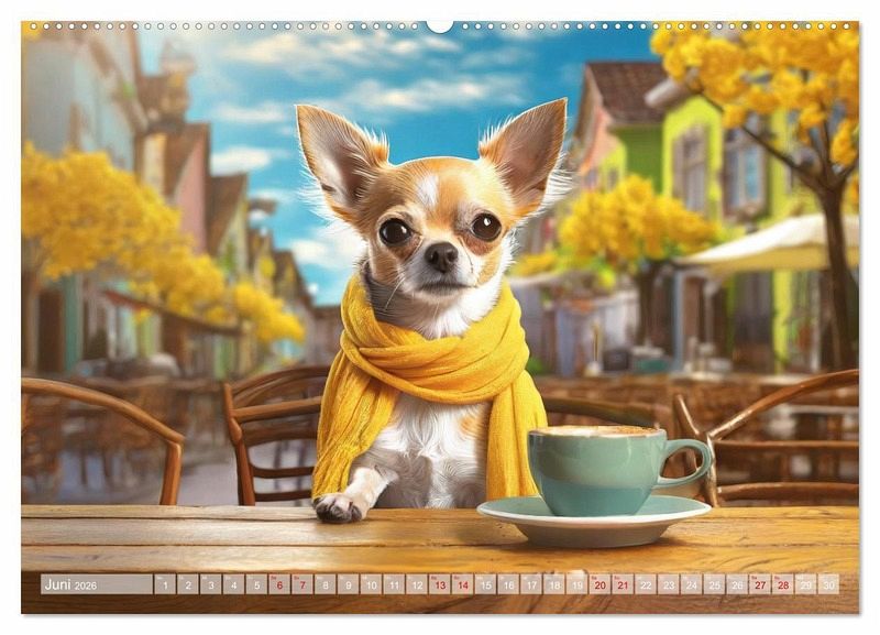 Juni: Chihuahua sitzt im Straßencafe vor einer großen Tasse Kaffee in der Sonne