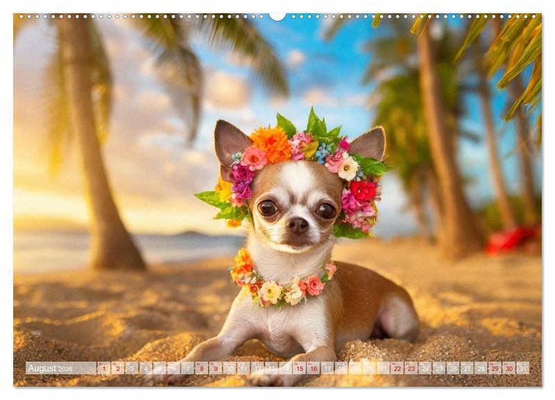 August: Chihuahua mit einem Blütenkranz liegt am Strand im Sonnenuntergang