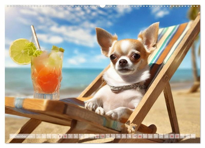 September: Kleiner Chihuahua chillt auf einem Liegestuhl am Strand, vor sich ein bunter Cocktail