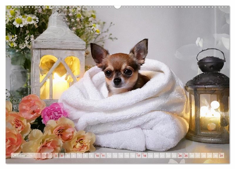 Oktober: Kleiner Chihuahua beim Wellness, eingehüllt in ein weiches Handtuch