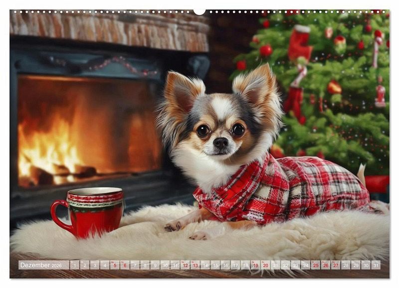 Dezember: Chihuahua liegt auf einem flauschigen Fell vor dem Kamin, neben sich eine Tasse Tee