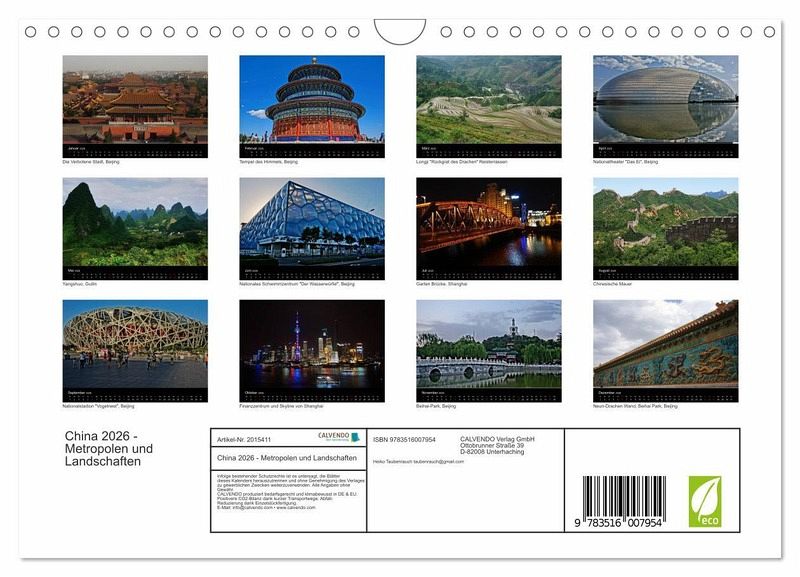 QUALITÄT - Hochwertiger Fotokalender mit 12 wunderschönen Motiven auf lichtbeständigem Bilderdruckpapier, robuste Spiralbindung mit Aufhängebügel.NACHHALTIG - deutliche Abfallreduzierung durch bedarfsgerechte Einzelstückfertigung, umweltfreundliches FSC-zertifiziertes Papier, Produktion in Deutschland, klimabewusste Logistik.PERFEKTES GESCHENK - Kalender für Freunde und Familie, für Kinder und Erwachsene, jung und alt, zu Weihnachten, Geburtstag oder zwischendurch.VIELFALT - Bildkalender in verschiedenen Formaten, z.B. DIN A5, DIN A4, DIN A3 sowie DIN A2. Ob Naturmotiv, Gemälde oder Fotos, ideal für ein persönliches Wohlfühlambiente.Eine Reise zwischen modernen Metropolen und den schönsten Naturlandschaften im Reich der Mitte. von Autor(in): Heiko Taubenrauch