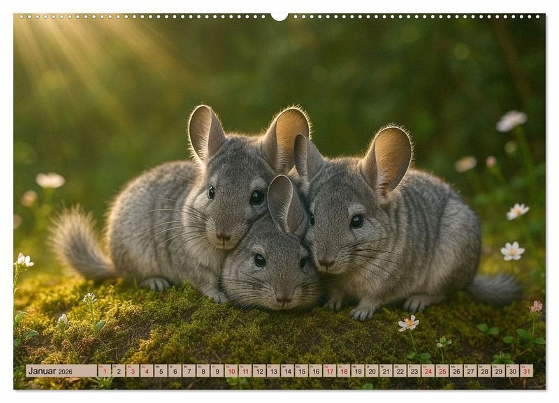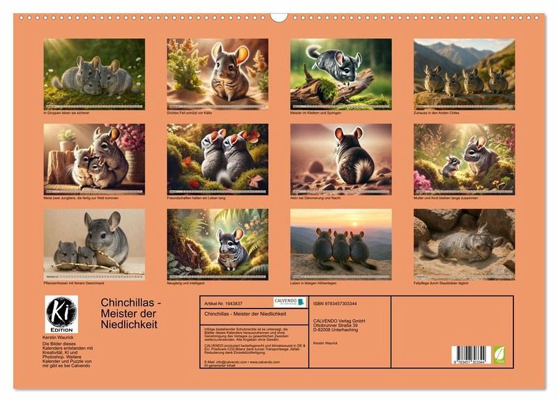 Chinchillas - Meister der Niedlichkeit, ist der Kalender, der dein Herz Monat für Monat flauschig umarmt. Zwölf liebevoll ausgewählte Bilder zeigen die süßesten Fellknäuel in Szene gesetzt - von verspielten Blicken bis zu staubigen Bädern. Unterstützt durch KI wurden die Bilder so gestaltet, dass sie liebevoll verzaubern. Perfekt für Tierfreunde, Kalenderfans und alle, die das ganze Jahr über eine Portion Niedlichkeit brauchen. Lass dich von Chinchilla-Charme durchs Jahr begleiten!