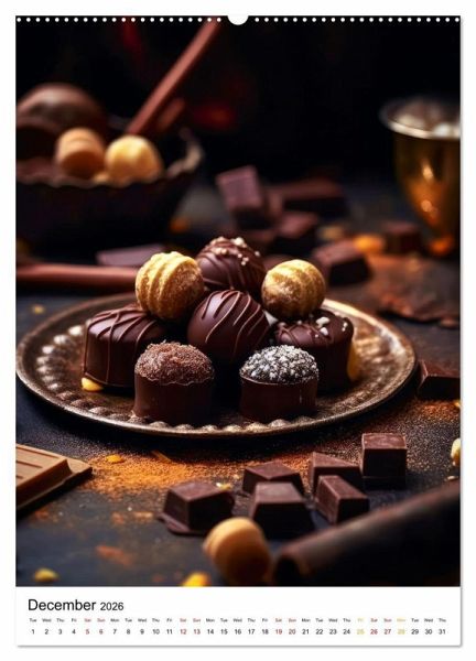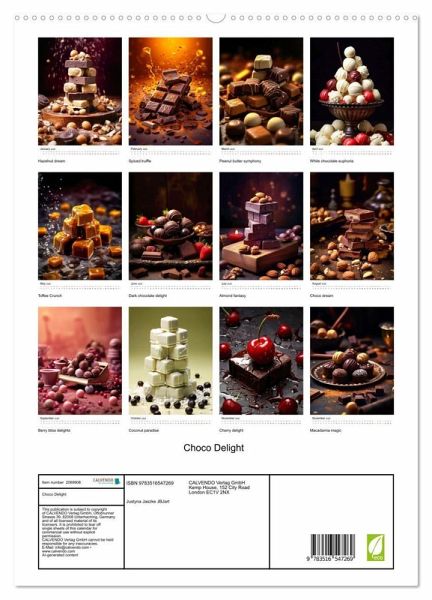 PREMIUM COLLECTION - Brilliant photo calendar with 12 beautiful motifs, high-gloss art print in museum quality.QUALITY - high-quality materials, sturdy back cover with 2 innovative insert pockets for optimum presentation on the wall.SUSTAINABLE - significant reduction in waste thanks to customised one-off production, environmentally friendly FSC-certified paper, production in Germany, climate-conscious logistics.PERFECT GIFT - calendars for friends and family, for children and adults, young and old, for Christmas, birthdays or in between.Indulge in a year of Choco Delight with our tantalizing calendar showcasing a mouthwatering assortment of chocolate treats. von Autor(in): JBJart