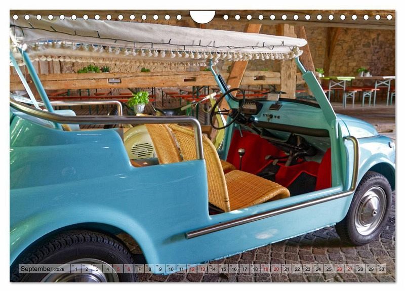September: Fiat für den Strand mit Korbsitzen und Sonnendach