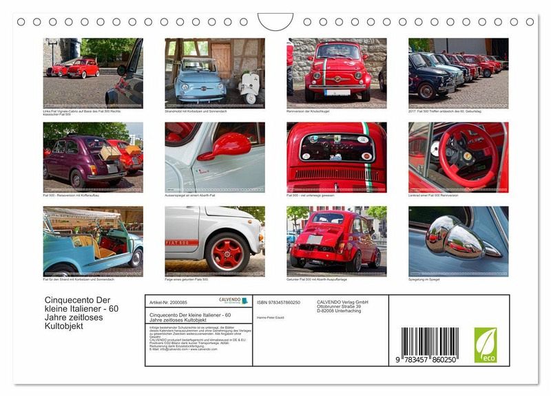 QUALITÄT - Hochwertiger Fotokalender mit 12 wunderschönen Motiven auf lichtbeständigem Bilderdruckpapier, robuste Spiralbindung mit Aufhängebügel.NACHHALTIG - deutliche Abfallreduzierung durch bedarfsgerechte Einzelstückfertigung, umweltfreundliches FSC-zertifiziertes Papier,Produktion in Deutschland, klimabewusste Logistik.PERFEKTES GESCHENK - Kalender für Freunde und Familie, für Kinder und Erwachsene, jung und alt, zu Weihnachten, Geburtstag oder zwischendurch.VIELFALT - Bildkalender in verschiedenen Formaten, z.B. DIN A5, DIN A4, DIN A3 sowie DIN A2. Ob Naturmotiv, Gemälde oder Fotos, ideal für ein persönliches Wohlfühlambiente.Fiat 500 - geliebte "Knutschkugel" von Autor(in): Hanns-Peter Eisold