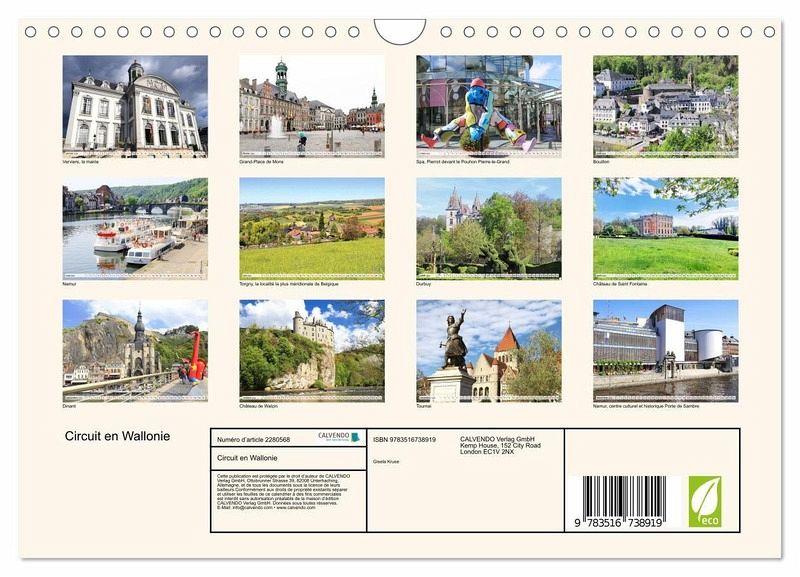 Ce calendrier photo vous emmène mois après mois à la découverte de la Wallonie. Des clichés à couper le souffle vous font découvrir la remarquable ville de Namur, la charmante Grand-Place de Mons et les environs pittoresques de la Meuse à Dinant, lieu de naissance d'Adolphe Sax. Bouillon et Torgny, le village le plus méridional de Belgique, sont également des destinations attrayantes. Et ne manquez pas Spa, la ville de l'eau, et les petits châteaux cachés de Saint Fontaine et Walzin.