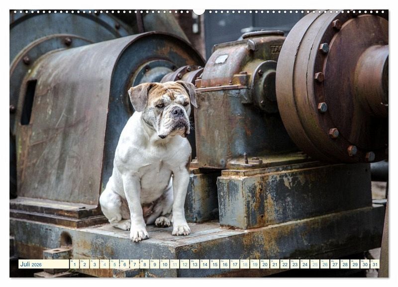 Juli: Old English Bulldog sitzt auf einer alten Maschine
