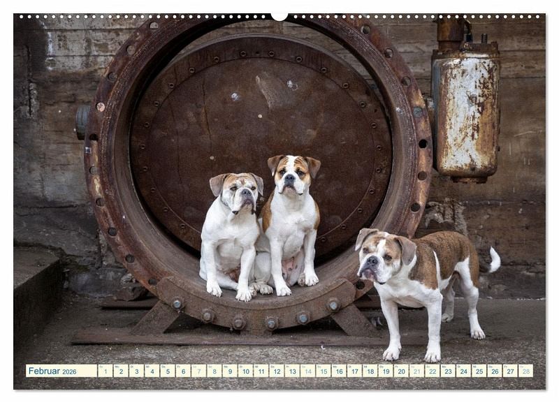 Februar: Drei Old English Bulldogs vor einem Eisenrad