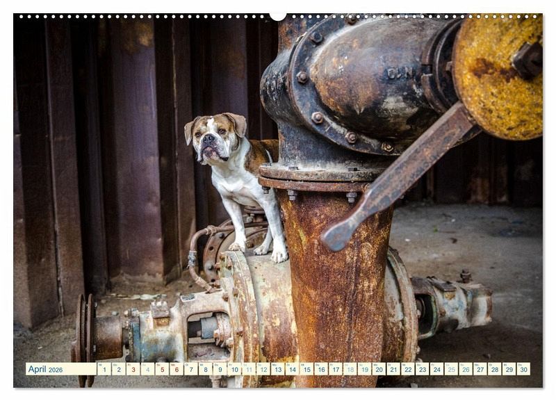 April: Old English Bulldog auf einer alten Turbine
