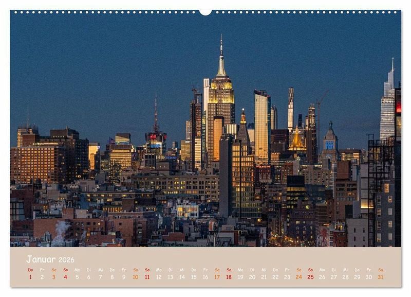 Dieser Kalender präsentiert beeindruckende Ansichten der Metropole aus ungewöhnlichen Perspektiven: von ikonischen Skylines bei Sonnenuntergang über bekannte Wahrzeichen wie die Brooklyn Bridge und das Empire State Building bis hin zu stimmungsvollen Impressionen aus dem Central Park oder der U-Bahn.