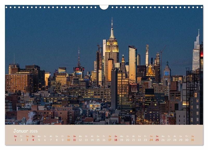 Dieser Kalender präsentiert beeindruckende Ansichten der Metropole aus ungewöhnlichen Perspektiven: von ikonischen Skylines bei Sonnenuntergang über bekannte Wahrzeichen wie die Brooklyn Bridge und das Empire State Building bis hin zu stimmungsvollen Impressionen aus dem Central Park oder der U-Bahn.