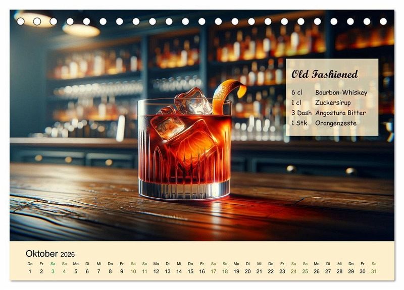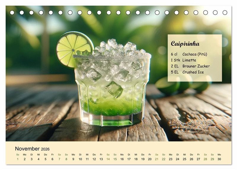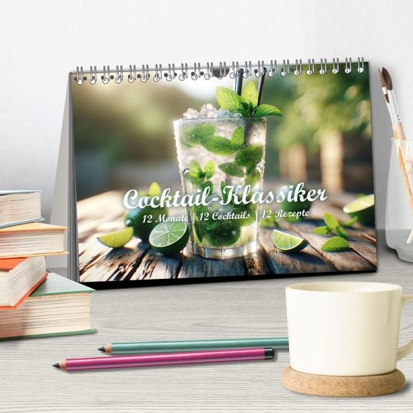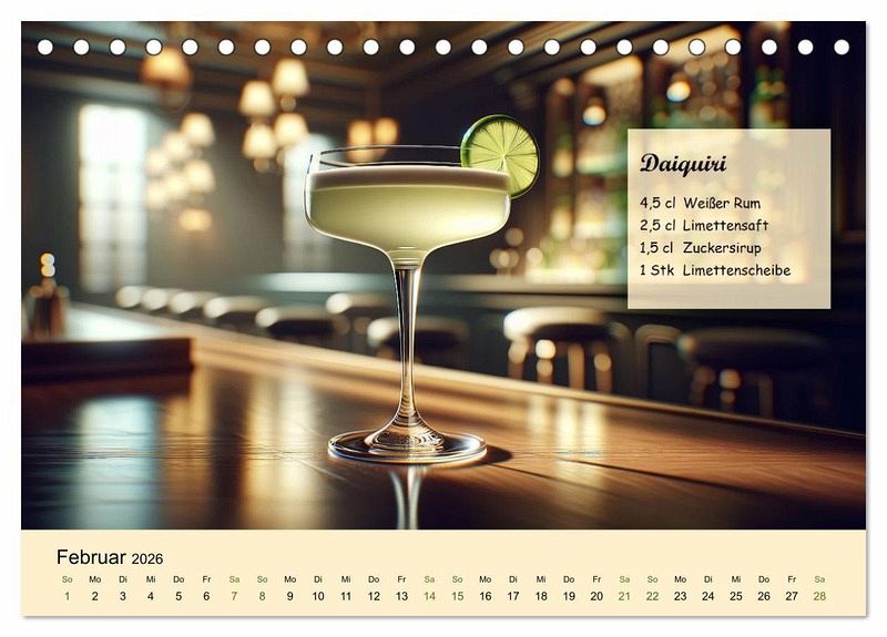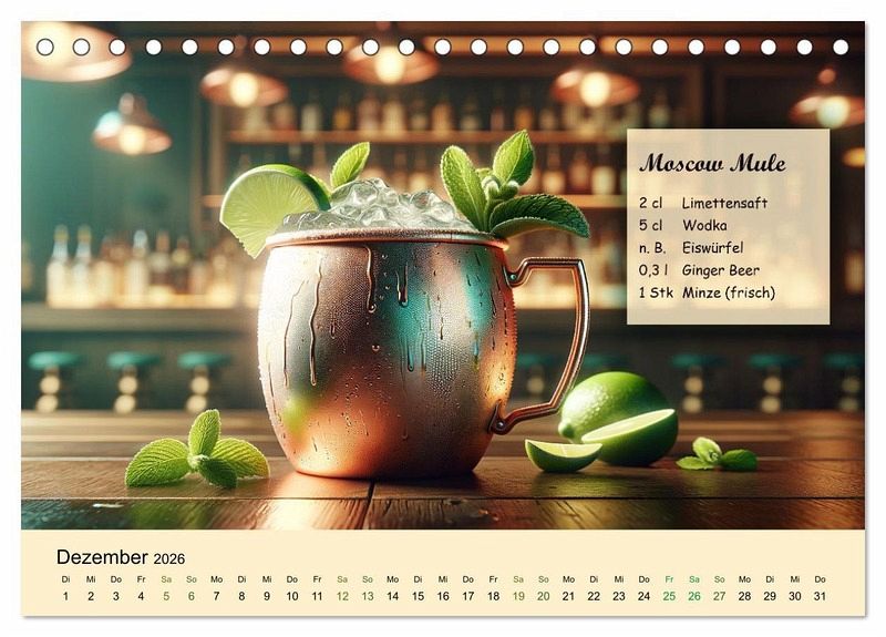 Mit einer Mischung aus farbenfrohen, von künstlicher Intelligenz (KI) erschaffenen Bildern und den entsprechenden Zutaten ist dieser Kalender nicht nur ein praktisches Werkzeug, sondern auch ein wunderschöner Blickfang. Er eignet sich perfekt für die Küche, die Hausbar oder als Geschenk für Cocktail-Liebhaber.