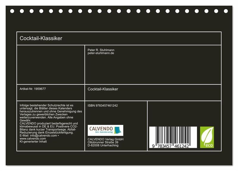 QUALITÄT - Hochwertiger Fotokalender mit 12 wunderschönen Motiven auf lichtbeständigem Bilderdruckpapier, robuste Spiralbindung.NACHHALTIG - deutliche Abfallreduzierung durch bedarfsgerechte Einzelstückfertigung, umweltfreundliches FSC-zertifiziertes Papier, Produktion in Deutschland, klimabewusste Logistik.PERFEKTES GESCHENK - Kalender für Freunde und Familie, für Kinder und Erwachsene, jung und alt, zu Weihnachten, Geburtstag oder zwischendurch.VIELFALT - Bildkalender in verschiedenen Formaten, z.B. DIN A5, DIN A4, DIN A3 sowie DIN A2. Ob Naturmotiv, Gemälde oder Fotos, ideal für ein persönliches Wohlfühlambiente.12 berühmte Cocktails mit Rezepten von Autor(in): Peter R. Stuhlmann