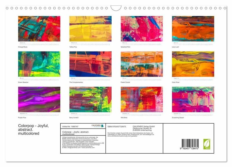 Colorpop bringt Schwung und Vitalität in den Alltag. Farbenfrohe Werke aus der Öl- und Acrylmalerei verzaubern und inspirieren den Betrachter gleichermaßen. Bringen sie mit dem einzigartigen Kalender und handgemachten Malereien Freude und Happiness in ihren Raum.