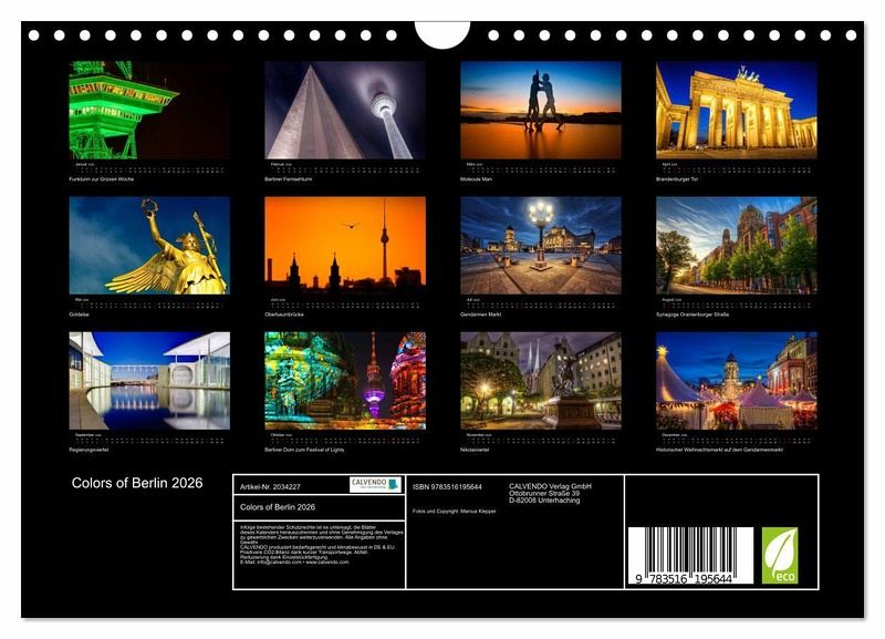 QUALITÄT - Hochwertiger Fotokalender mit 12 wunderschönen Motiven auf lichtbeständigem Bilderdruckpapier, robuste Spiralbindung mit Aufhängebügel.NACHHALTIG - deutliche Abfallreduzierung durch bedarfsgerechte Einzelstückfertigung, umweltfreundliches FSC-zertifiziertes Papier, Produktion in Deutschland, klimabewusste Logistik.PERFEKTES GESCHENK - Kalender für Freunde und Familie, für Kinder und Erwachsene, jung und alt, zu Weihnachten, Geburtstag oder zwischendurch.VIELFALT - Bildkalender in verschiedenen Formaten, z.B. DIN A5, DIN A4, DIN A3 sowie DIN A2. Ob Naturmotiv, Gemälde oder Fotos, ideal für ein persönliches Wohlfühlambiente.Aufnahmen von Berlin, die unsere Hauptstadt in seiner ganzen Farbenpracht präsentieren. von Autor(in): Marcus Klepper