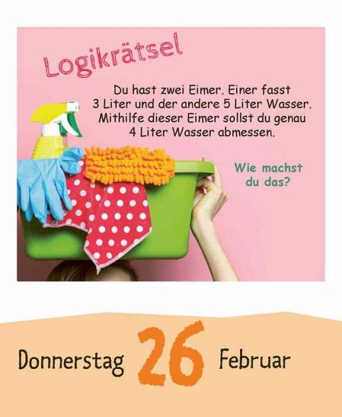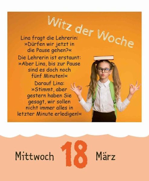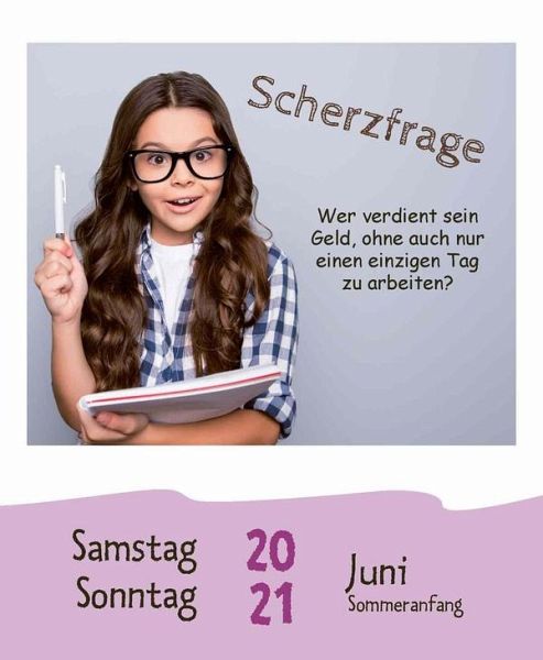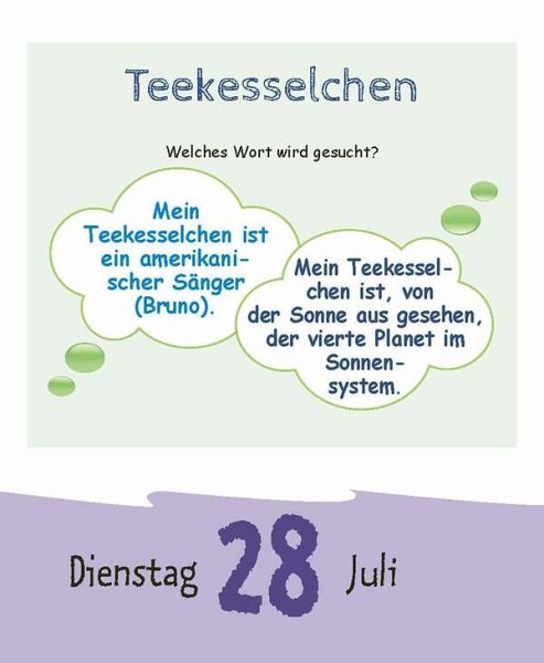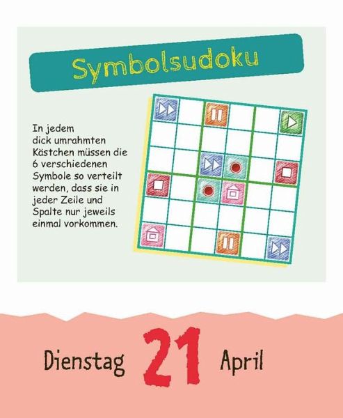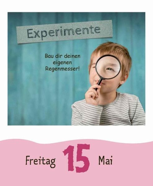 Dieser Kalender ist ein der perfekte Jahresbegleiter für aktive und wissbegierige Kids. Experimente, Bastelanleitungen, kurze Rezepte, Rätsel, Denkspiele und vieles mehr machen jeden Tag zu einem neuen Abenteuer. Da hat Langeweile keine Chance!