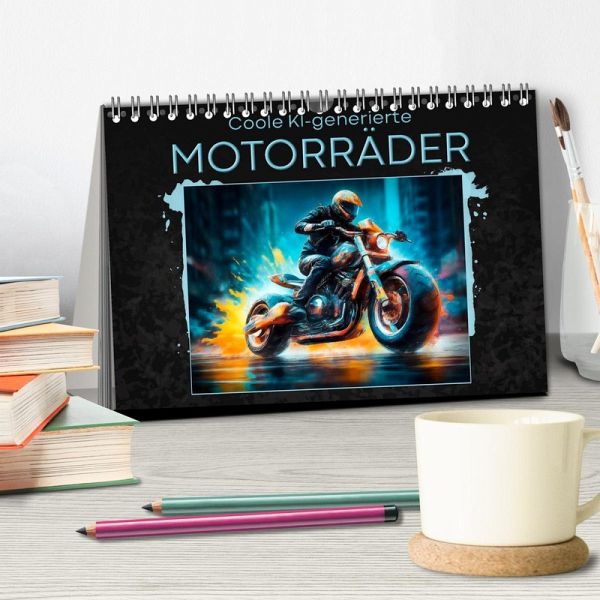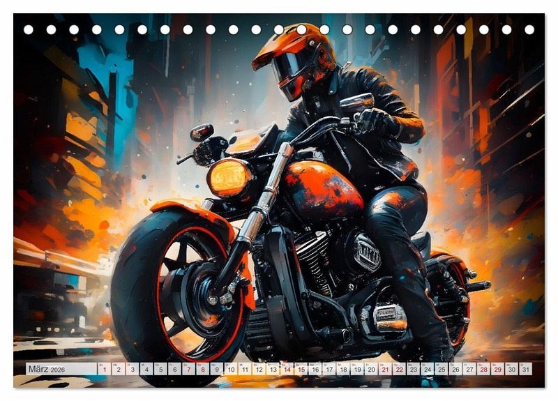 Futuristische Bikes rasen durch Straßenschluchten und lassen den Betrachter in eine fiktive Gaming-Welt eintauchen. Actiongeladene Momentaufnahmen mit Farbexplosionen zeigen die abstrakt gezeichneten Motorräder in einer modernen urbanen Struktur. Die Motive wurden in Zusammenarbeit mit künstlicher Intelligenz erschaffen und durch die Kalenderautorin zu ihrem finalen Erscheinungsbild verfeinert.