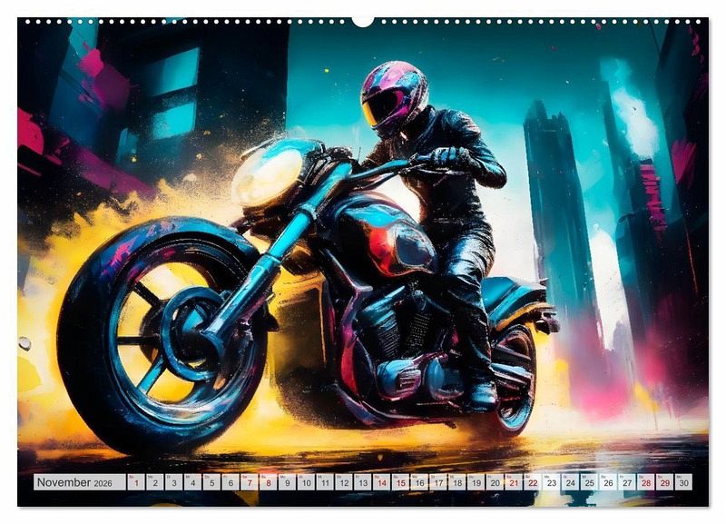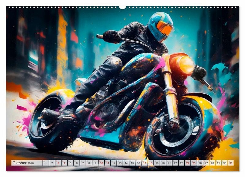 Futuristische Bikes rasen durch Straßenschluchten und lassen den Betrachter in eine fiktive Gaming-Welt eintauchen. Actiongeladene Momentaufnahmen mit Farbexplosionen zeigen die abstrakt gezeichneten Motorräder in einer modernen urbanen Struktur. Die Motive wurden in Zusammenarbeit mit künstlicher Intelligenz erschaffen und durch die Kalenderautorin zu ihrem finalen Erscheinungsbild verfeinert.
