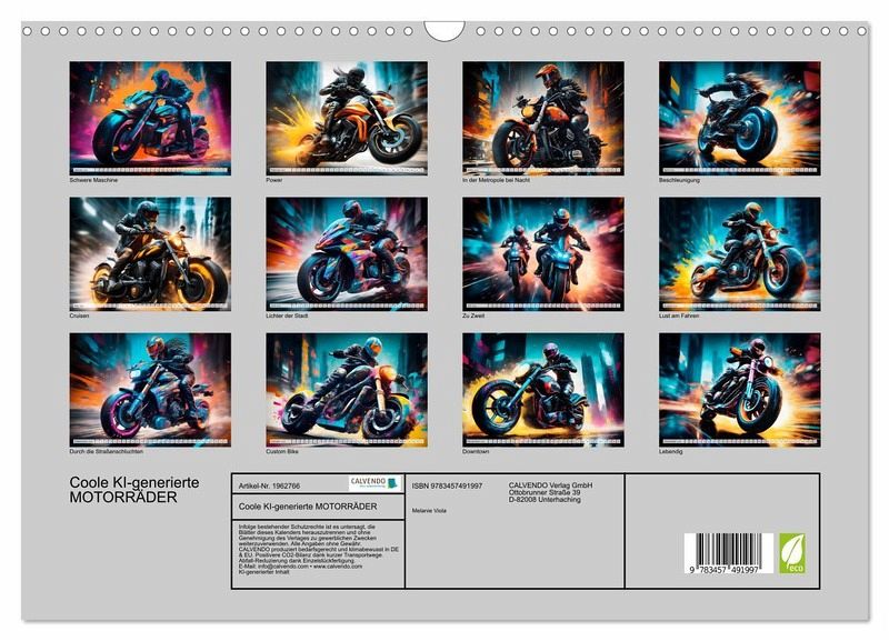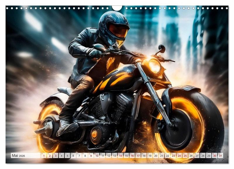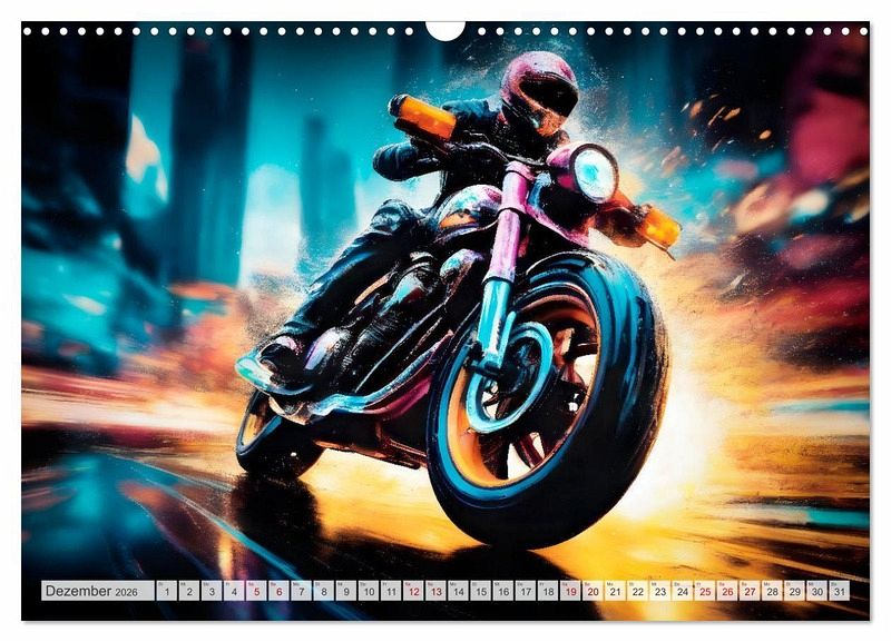 Futuristische Bikes rasen durch Straßenschluchten und lassen den Betrachter in eine fiktive Gaming-Welt eintauchen. Actiongeladene Momentaufnahmen mit Farbexplosionen zeigen die abstrakt gezeichneten Motorräder in einer modernen urbanen Struktur. Die Motive wurden in Zusammenarbeit mit künstlicher Intelligenz erschaffen und durch die Kalenderautorin zu ihrem finalen Erscheinungsbild verfeinert.