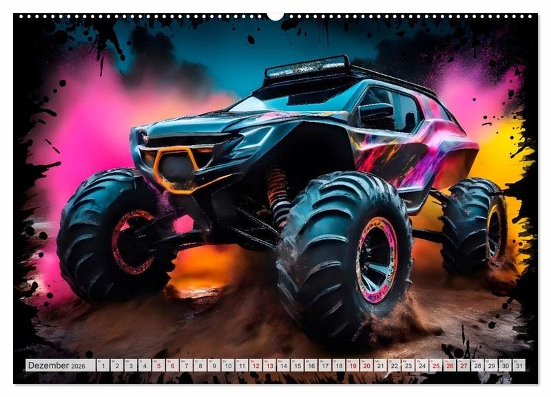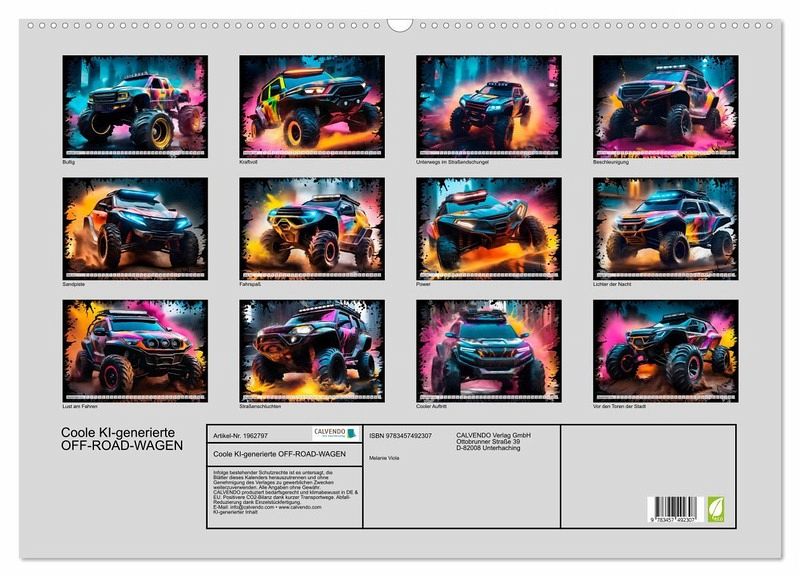 Futuristische Geländewagen rasen durch Straßenschluchten und lassen den Zuschauer in eine fiktive Gaming-Welt eintauchen. Actiongeladene Momentaufnahmen mit Farbexplosionen zeigen die abstrakt gezeichneten Fahrzeuge in einer modernen urbanen Struktur. Die Motive wurden in Zusammenarbeit mit künstlicher Intelligenz erschaffen und durch die Kalenderautorin zu ihrem finalen Erscheinungsbild veredelt.