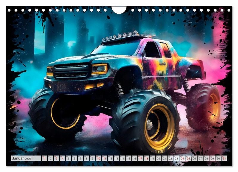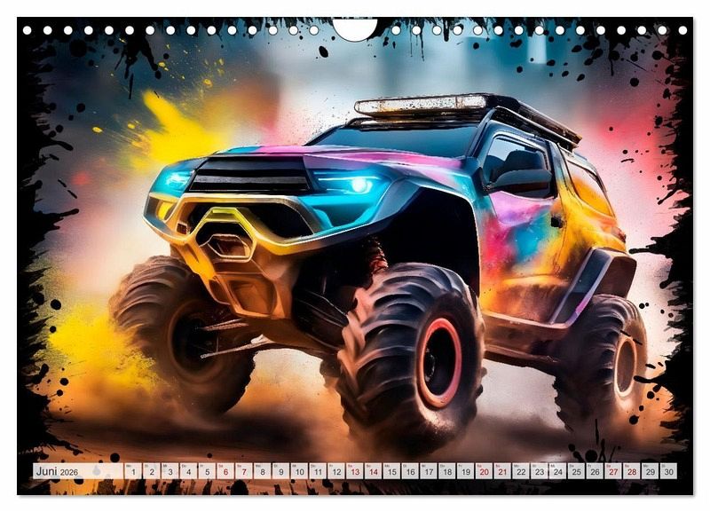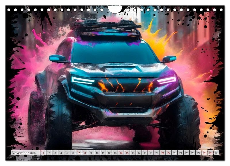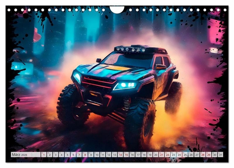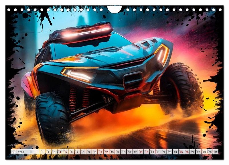 Futuristische Geländewagen rasen durch Straßenschluchten und lassen den Zuschauer in eine fiktive Gaming-Welt eintauchen. Actiongeladene Momentaufnahmen mit Farbexplosionen zeigen die abstrakt gezeichneten Fahrzeuge in einer modernen urbanen Struktur. Die Motive wurden in Zusammenarbeit mit künstlicher Intelligenz erschaffen und durch die Kalenderautorin zu ihrem finalen Erscheinungsbild veredelt.