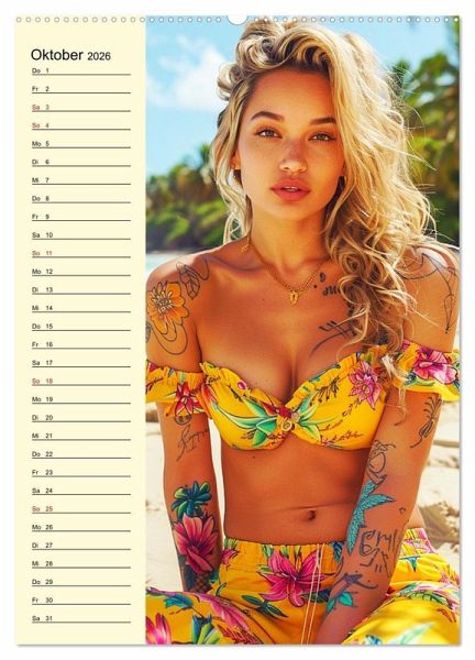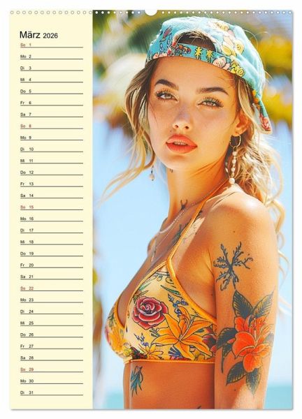 Dieser Kalender präsentiert zwölf hübsche Models mit kunstvollen Tattoos an malerischen Stränden. Jedes Bild wurde mit Hilfe von KI erstellt und fängt die Schönheit und Individualität der Frauen in modernen, sexy und sommerlichen Posen ein. Dieser Kalender ist eine Freude für Liebhaber von Tattoo-Kunst und Strandästhetik. Er verbindet die Faszination für Körperkunst mit der Schönheit der zauberhaften Frauen.