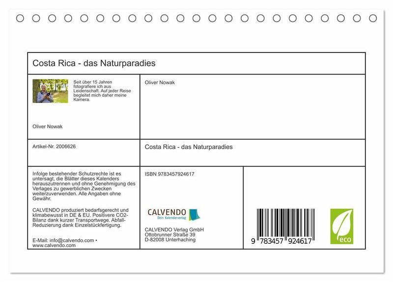 QUALITÄT - Hochwertiger Fotokalender mit 12 wunderschönen Motiven auf lichtbeständigem Bilderdruckpapier, robuste Spiralbindung.NACHHALTIG - deutliche Abfallreduzierung durch bedarfsgerechte Einzelstückfertigung, umweltfreundliches FSC-zertifiziertes Papier, Produktion in Deutschland, klimabewusste Logistik.PERFEKTES GESCHENK - Kalender für Freunde und Familie, für Kinder und Erwachsene, jung und alt, zu Weihnachten, Geburtstag oder zwischendurch.VIELFALT - Bildkalender in verschiedenen Formaten, z.B. DIN A5, DIN A4, DIN A3 sowie DIN A2. Ob Naturmotiv, Gemälde oder Fotos, ideal für ein persönliches Wohlfühlambiente.Costa Rica - Eines der schönsten Naturparadiese der Erde von Autor(in): Oliver Nowak