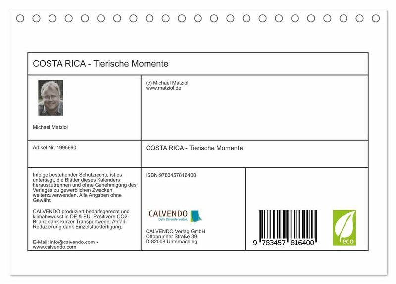QUALITÄT - Hochwertiger Fotokalender mit 12 wunderschönen Motiven auf lichtbeständigem Bilderdruckpapier, robuste Spiralbindung.NACHHALTIG - deutliche Abfallreduzierung durch bedarfsgerechte Einzelstückfertigung, umweltfreundliches FSC-zertifiziertes Papier, Produktion in Deutschland, klimabewusste Logistik.PERFEKTES GESCHENK - Kalender für Freunde und Familie, für Kinder und Erwachsene, jung und alt, zu Weihnachten, Geburtstag oder zwischendurch.VIELFALT - Bildkalender in verschiedenen Formaten, z.B. DIN A5, DIN A4, DIN A3 sowie DIN A2. Ob Naturmotiv, Gemälde oder Fotos, ideal für ein persönliches Wohlfühlambiente.Kleiner Einblick in die Tierwelt Costa Ricas von Autor(in): Michael Matziol