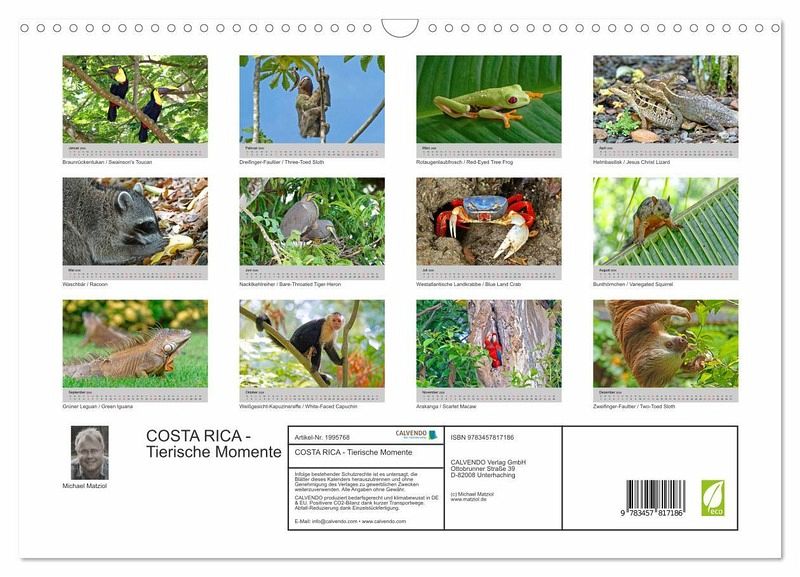 Dieser Kalender richtet sich an Naturliebhaber und Tierfreunde und gibt einen kleinen Einblick in die Tierwelt Costa Ricas. Der kleine Staat in Mittelamerika ist ein Sehnsuchtsziel für viele Menschen wegen seiner üppigen Natur und Artenvielfalt.