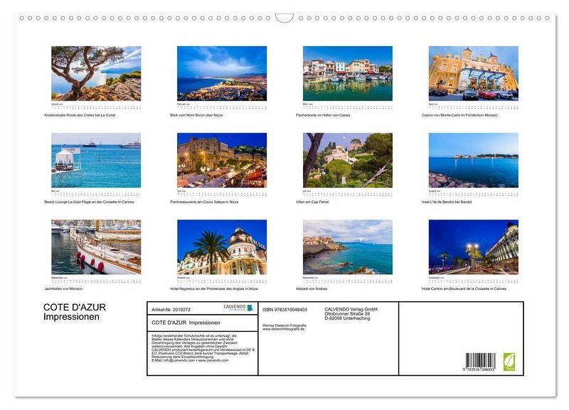 QUALITÄT - Hochwertiger Fotokalender mit 12 wunderschönen Motiven auf lichtbeständigem Bilderdruckpapier, robuste Spiralbindung mit Aufhängebügel.NACHHALTIG - deutliche Abfallreduzierung durch bedarfsgerechte Einzelstückfertigung, umweltfreundliches FSC-zertifiziertes Papier, Produktion in Deutschland, klimabewusste Logistik.PERFEKTES GESCHENK - Kalender für Freunde und Familie, für Kinder und Erwachsene, jung und alt, zu Weihnachten, Geburtstag oder zwischendurch.VIELFALT - Bildkalender in verschiedenen Formaten, z.B. DIN A5, DIN A4, DIN A3 sowie DIN A2. Ob Naturmotiv, Gemälde oder Fotos, ideal für ein persönliches Wohlfühlambiente.Die Cote d'Azur oder auch Französische Riviera in 13 faszinierenden Aufnahmen. von Autor(in): Werner Dieterich