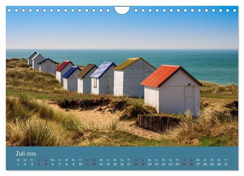 Juli: Badehäuschen in den Dünen von Gouville-sur-Mer