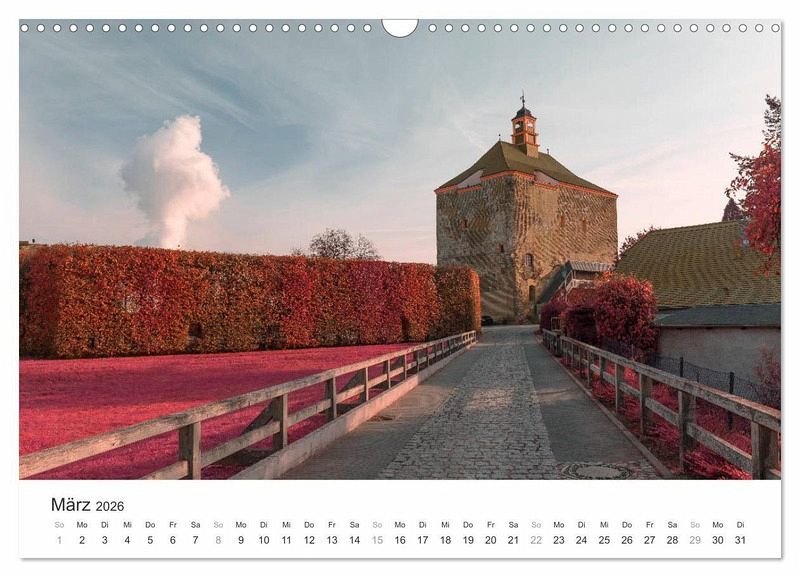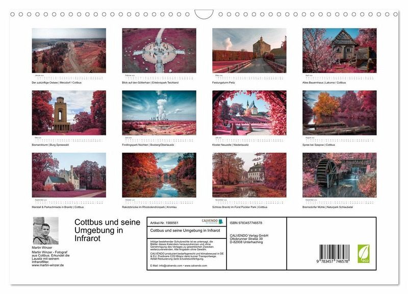 Der Kalender präsentiert Ihnen Cottbus und seine Umgebung im Stil des alten Analog-Film Kodak Aerochrome. Er wurde für den Einsatz bei der militärischen Luftaufklärung entwickelt und wird heute nicht mehr hergestellt. Entdecken Sie das prächtige Schloss Branitz in Cottbus, den Findlingspark Nochten oder die Bremsdorfer Mühle im Schlaubetal in digital erzeugten Infrarotaufnahmen.