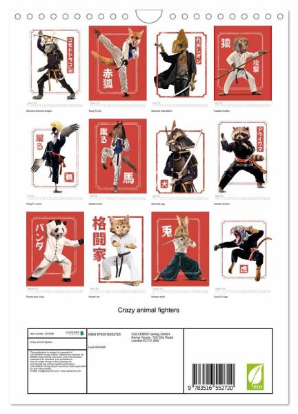 QUALITY - High-quality photo calendar with 12 beautiful images on light-resistant paper, robust spiral binding with hanger.SUSTAINABLE - Significant waste reduction due to print-on-demand production, environmentally friendly FSC-certified paper, produced in the UK, climate-conscious logistical processes.PERFECT GIFT - calendars for friends and family, for children, all ages and all occasions, from Christmas to birthdays and everything in between.LOTS OF CHOICE - Wall calendars in different sizes (DIN A4 and DIN A3), for any topic and personal taste, featuring photography, painting and illustrations.12 funny, crazy, animal karate and kung fu fighters, author: Luca Schmidt