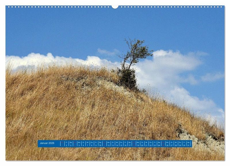 Januar: Hügel unter blauem Himmel mit weißen Wolken