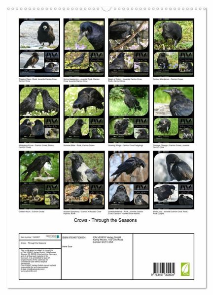 PREMIUM COLLECTION - Brilliant photo calendar with 12 beautiful motifs, high-gloss art print in museum quality.QUALITY - high-quality materials, sturdy back cover with 2 innovative insert pockets for optimum presentation on the wall.SUSTAINABLE - significant reduction in waste thanks to customised one-off production, environmentally friendly FSC-certified paper, production in Germany, climate-conscious logistics.PERFECT GIFT - calendars for friends and family, for children and adults, young and old, for Christmas, birthdays or in between.Crows - a fascinating journey through the year with intelligent and playful corvids in vibrant settings that highlight their cheerful and lovable nature. von Autor(in): Irene Saar