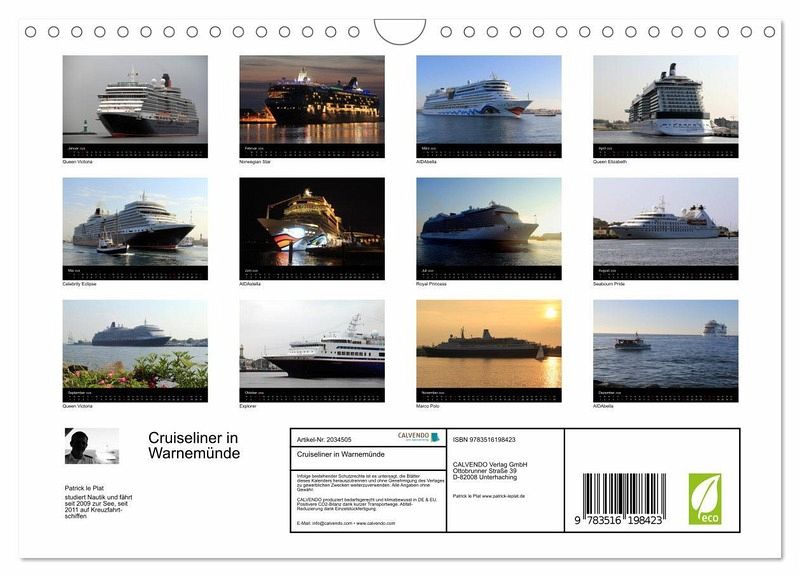 Warnemünde, ehemals kleines Fischerdorf vor den Toren Rostocks, an der Mündung der Warnow in die Ostsee gelegen, hat sich in den letzten Jahren zu einem Treffpunkt der großen und faszinierenden Kreuzfahrtschiffe entwickelt. Die schönsten ihrer Art sind in diesem Kalender abgebildet und schüren jeden Monat auf's Neue das Fernweh und die Faszination des Betrachters.