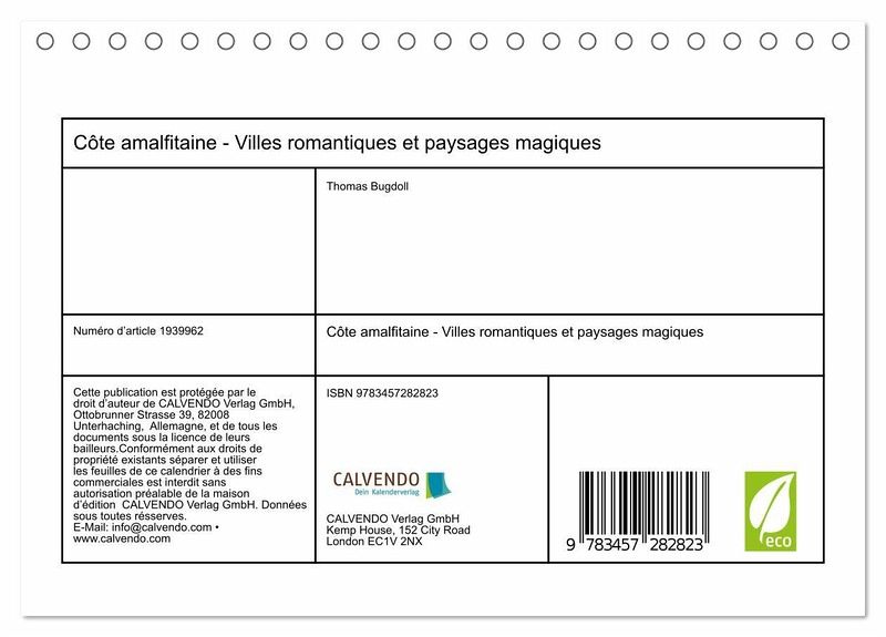 Laissez-vous enchanter par la beauté à couper le souffle de la côte amalfitaine ! Ce calendrier photo exclusif vous emmène mois après mois dans l'une des régions les plus pittoresques d'Italie, connue pour ses villes charmantes, ses sites historiques et sa nature impressionnante.Les belles photographies capturent l'essence de ce paysage de rêve.Ajoutez une touche méditerranéenne à votre maison ou votre bureau et rêvez dans un monde plein de romantisme et de tranquillité. Le calendrier est le cadeau parfait pour tous ceux qui aiment l'Italie et souhaitent découvrir la côte amalfitaine dans toute sa splendeur.12 mois - 12 moments inoubliables. Ramenez votre morceau de côte amalfitaine à la maison !