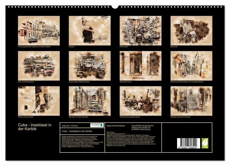 Malerische Stadtviertel aus der Kolonialzeit, Oldtimer in knalligen Farben, endlose Sandstrände - Kuba. Noch ist eine Reise nach Kuba eine Reise in die Vergangenheit. Das Land ist arm, der Staat bankrott. Es gibt sie schon, die renovierten Fassaden, aber viele bröckeln noch und die Farbe ist ab. Doch die Tatsache, dass die USA dem einstigen Feind die Hand ausgestreckt hat, lässt für die Zukunft hoffen. Der Fotokünstler Peter Roder hat für diesen Kalender zwölf beeindruckende Aufnahmen aus dem Inselstaat zusammengestellt und gestaltet, eine Freude für jeden Freund dieses imposanten Landes und ein Begleiter für das ganze Jahr.