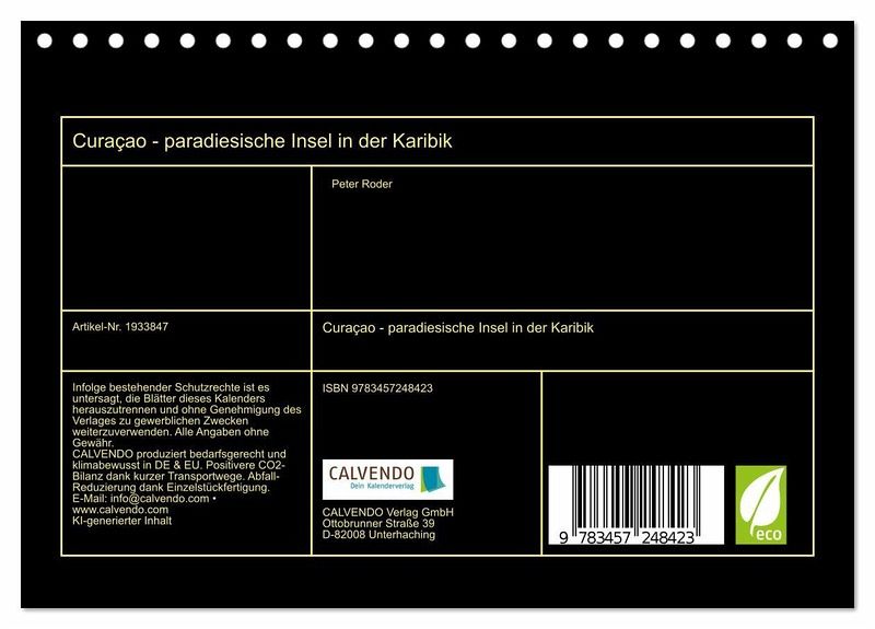 Curaçao - ein funkelndes Juwel inmitten des türkisfarbenen Wassers der Karibik. Lassen Sie sich verzaubern vom Flair des "Amsterdam der Karibik" und damit von von der farbenfrohen Willemstad-Architektur. Genießen Sie atemberaubende Strände oder entdecken Sie charmante Dörfer und die versteckten Buchten entlang der Küsten. Der Fotokünstler Peter Roder hat zwölf grandiose KI-Bilder von Curaçao zusammengestellt und gestaltet. Perfekt für alle Liebhaber und Liebhaberinnen der Karibik und für alle reisefreudigen Inselfans.