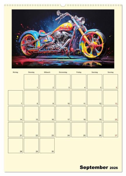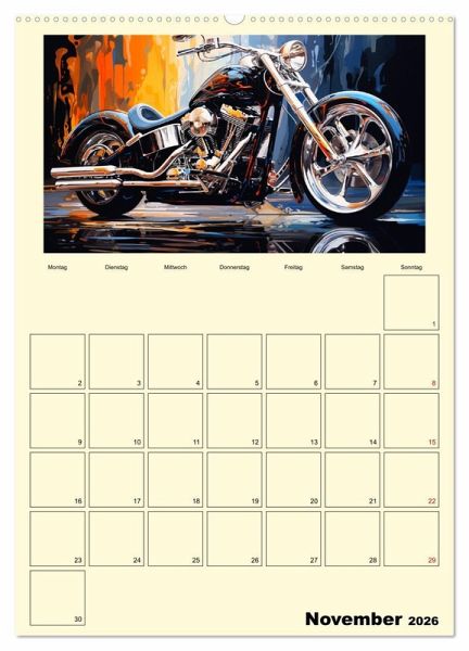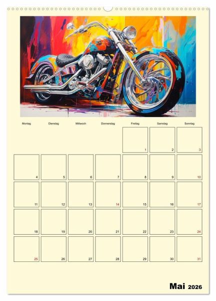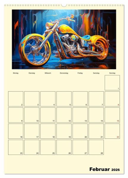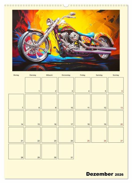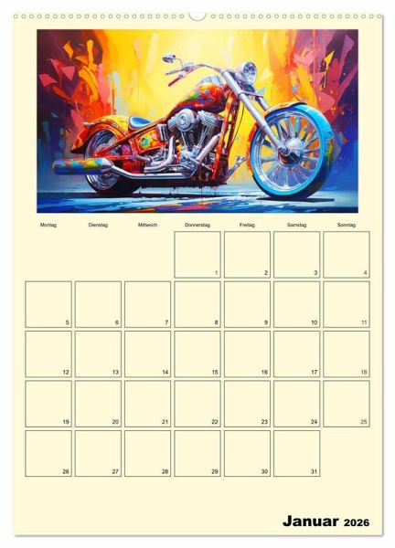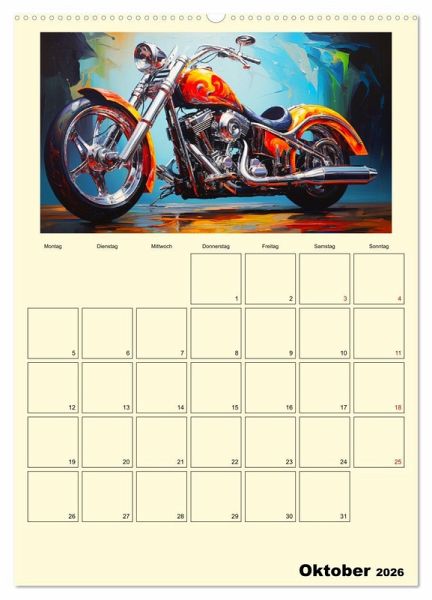 Entdecken Sie die faszinierenden Motorrad-Illustrationen im Ölgemälde-Stil, die Ihre wildesten Träume von maßgeschneiderten Fantasy-Custombike wahr werden lassen. Jedes Kunstwerk beeindruckt und wurde mit moderner KI-Technologie generiert, um eine perfekte Mischung aus Realität und Fantasie zu schaffen. Dieser Kalender ist ein absolutes Must-have für alle Liebhaber von Motorrädern und Kunst.