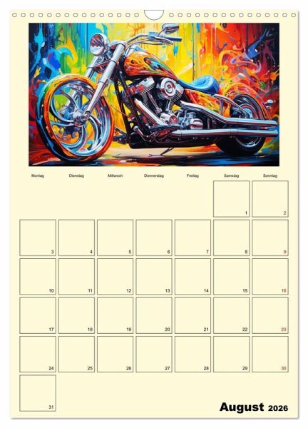 Entdecken Sie die faszinierenden Motorrad-Illustrationen im Ölgemälde-Stil, die Ihre wildesten Träume von maßgeschneiderten Fantasy-Custombike wahr werden lassen. Jedes Kunstwerk beeindruckt und wurde mit moderner KI-Technologie generiert, um eine perfekte Mischung aus Realität und Fantasie zu schaffen. Dieser Kalender ist ein absolutes Must-have für alle Liebhaber von Motorrädern und Kunst.