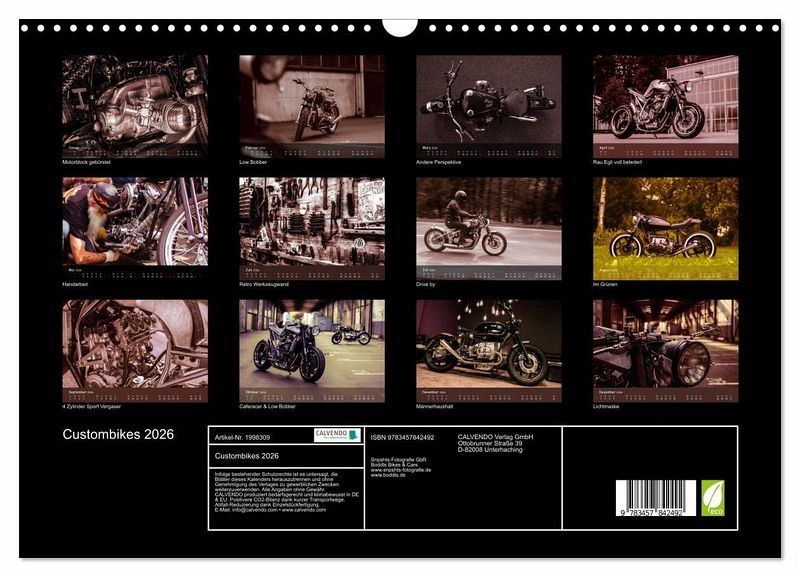 Motive aus der Custombike Szene. In diesem Kalender sind handgefertigte Unikate abgebildet. Vom Detail bis hin zum Drumherum, alles aus Schwabenhand. Tauchen Sie ab in eine andere Welt und genießen Sie die Reise zurück in die Vergangenheit.